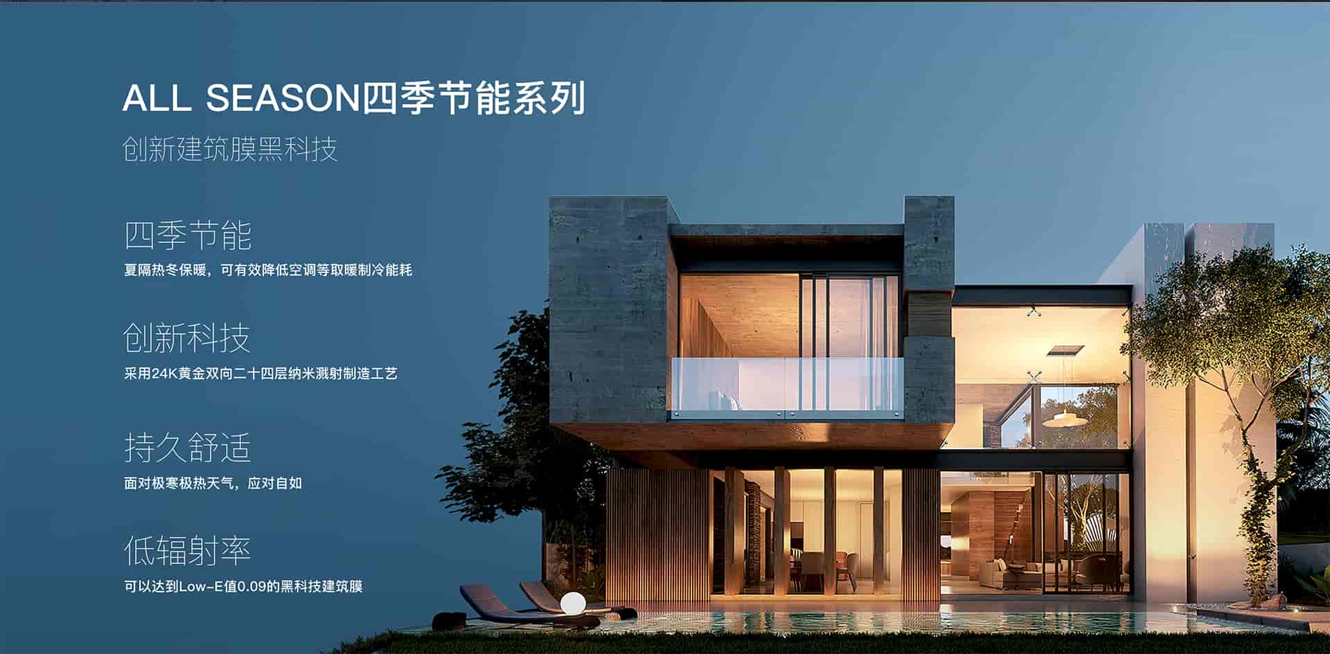Low-E 玻璃又称低辐射玻璃,与普通玻璃相比,具有优异的隔热效果和良好的透光性。玻璃辐射率越低,玻璃吸收热量的能力越低,反射热量能力越强。ALL SEASON INTELLIGENCE 65具有业界超低的 Low-E 值仅0.09,可应用于各种玻璃表面,使普通玻璃变身低辐射玻璃,为您维持四季舒适温度的同时达到节能效果。