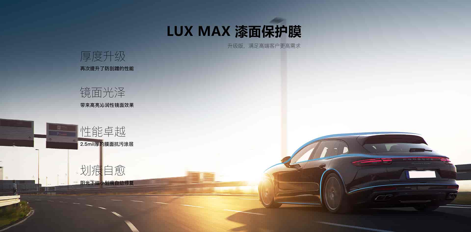 XPEL 总部针对中国市场的高端客户需求,不惜成本的再次升级了 LUX 产品系列,命名为 LUX MAX ,其厚度升级为9.5mil ,膜面抗污涂层2.5mil厚,再次大大提升了防刮蹭的性能。